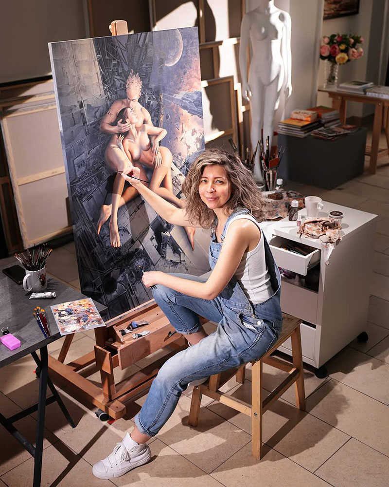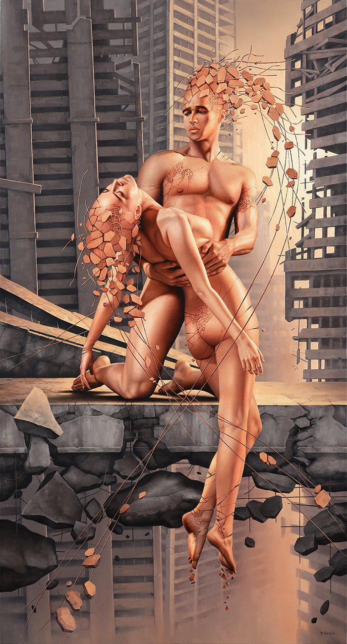 Creating is immeasurably more difficult than destroying. That is why strong contrasts appear in my paintings: beautiful human figures set within a devastated world. I place them there to invite reflection on the miracle of life — and on how easily we allow ourselves to destroy it.